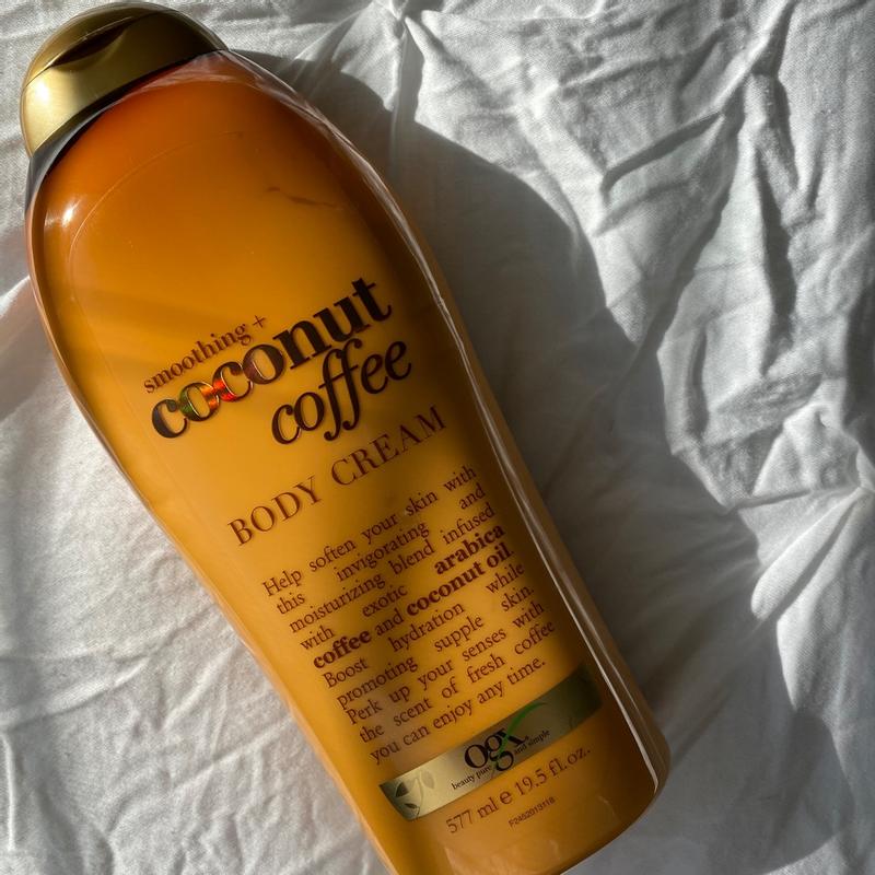 Our NEW OGX Coconut Coffee Body Cream is infused with exotic arabica coffee and coconut oil this amazingly smoothing and moisturizing blend will help soften and firm your skin. Purify moisturize and firm the skin with Coconut Coffee Body Scrub. OGX Smoothing And Coconut Coffee Body Cream ingredients explained.